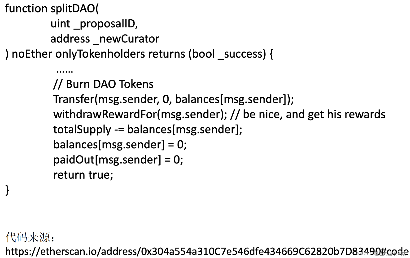 上图是split DAO的代码,从withdrawRewardFor这个语句开始,首先把钱还给调用这个函数的人,然后把The DAO中的总金额减少相应的数量,再把调用者的账户清0。在上一节讲过,正确的操作是先把账户清0,然后再转账。黑客就是利用这个漏洞进行的重入攻击,转走了5千万美元的以太币,差不多 1 3 \\frac{1}{3} 31