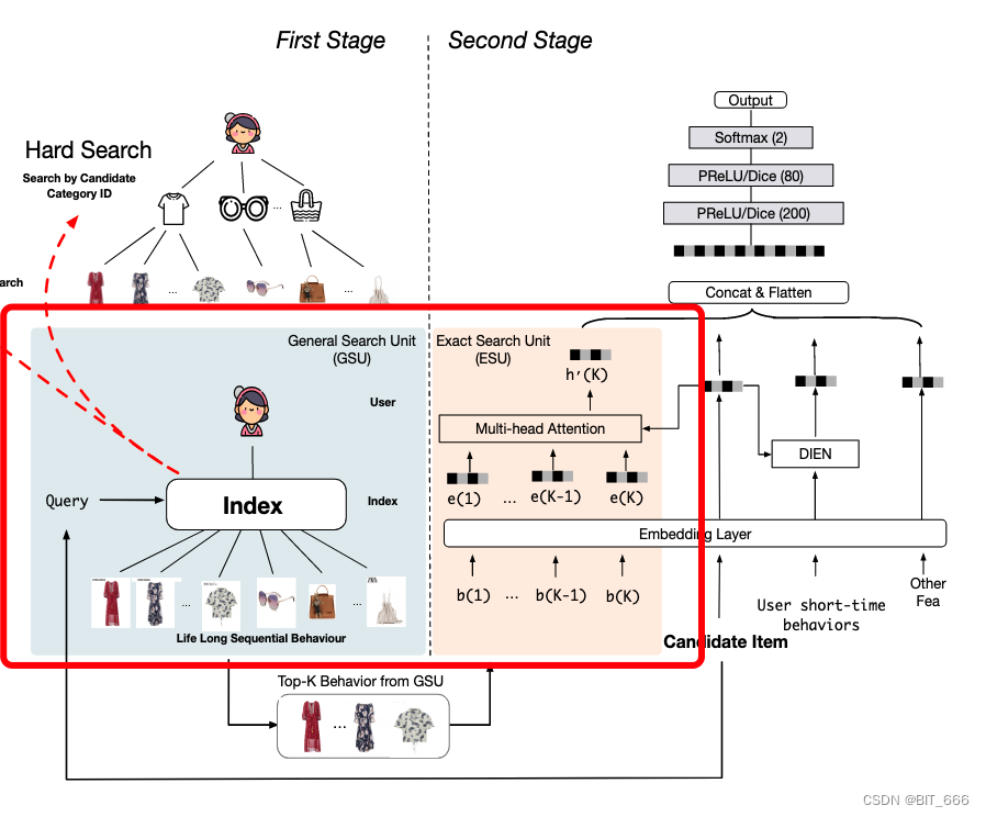 通用搜索单元GSU: 从原始的任意长顺序行为数据中进行通用搜索,结合候选项的查询信息,得到与候选项相关的子用户行为序列