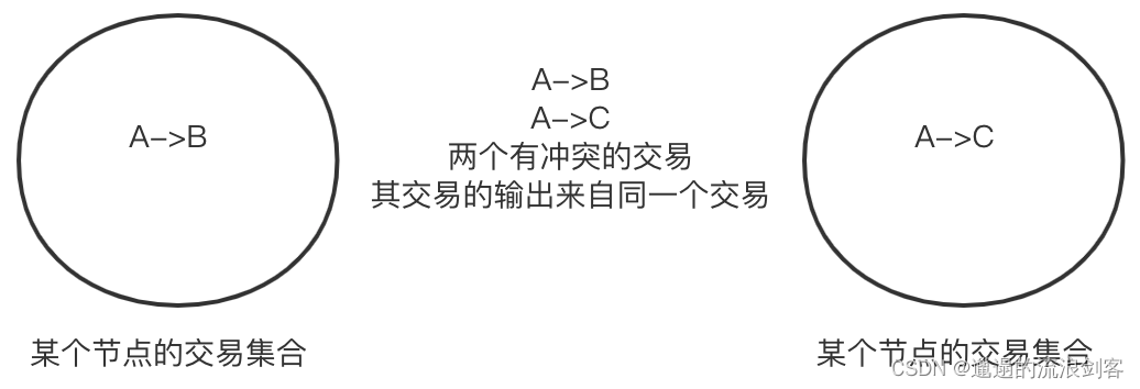 如果它收到了一个新发布的区块中包含A->C这个交易,这时也要将集合中A->B的交易删除掉,因为检查可以发现此时集合中的A->B这个交易是非法交易,它和新发布的区块中的A->C这个交易冲突了