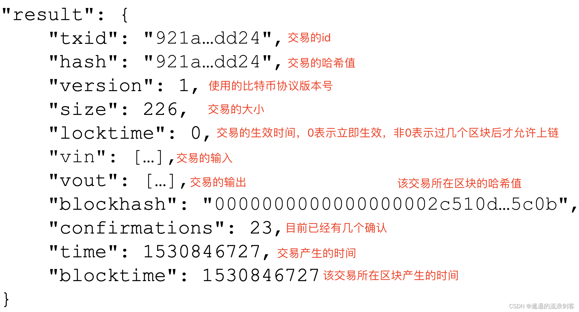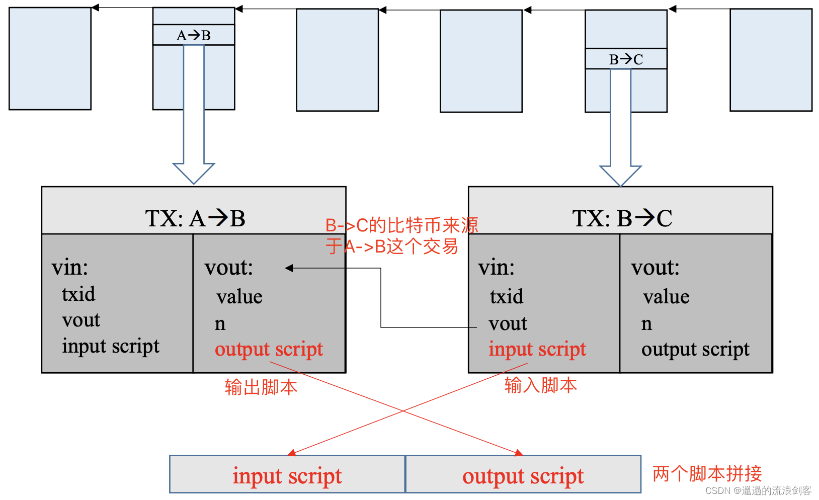 上图中两个交易分属两个区块,中间隔了两个区块,B->C的这个交易的比特币的来源是前面A->B的这个交易。所以右边这个交易中的相应输入的txid是左边这个交易的id,右边这个交易中的vout指向的是左边这个交易的对应输出