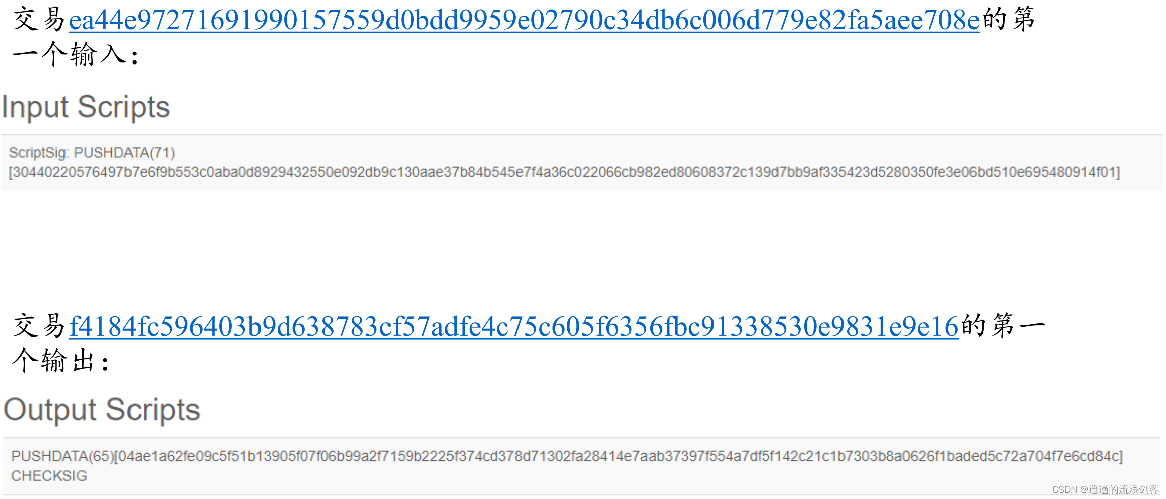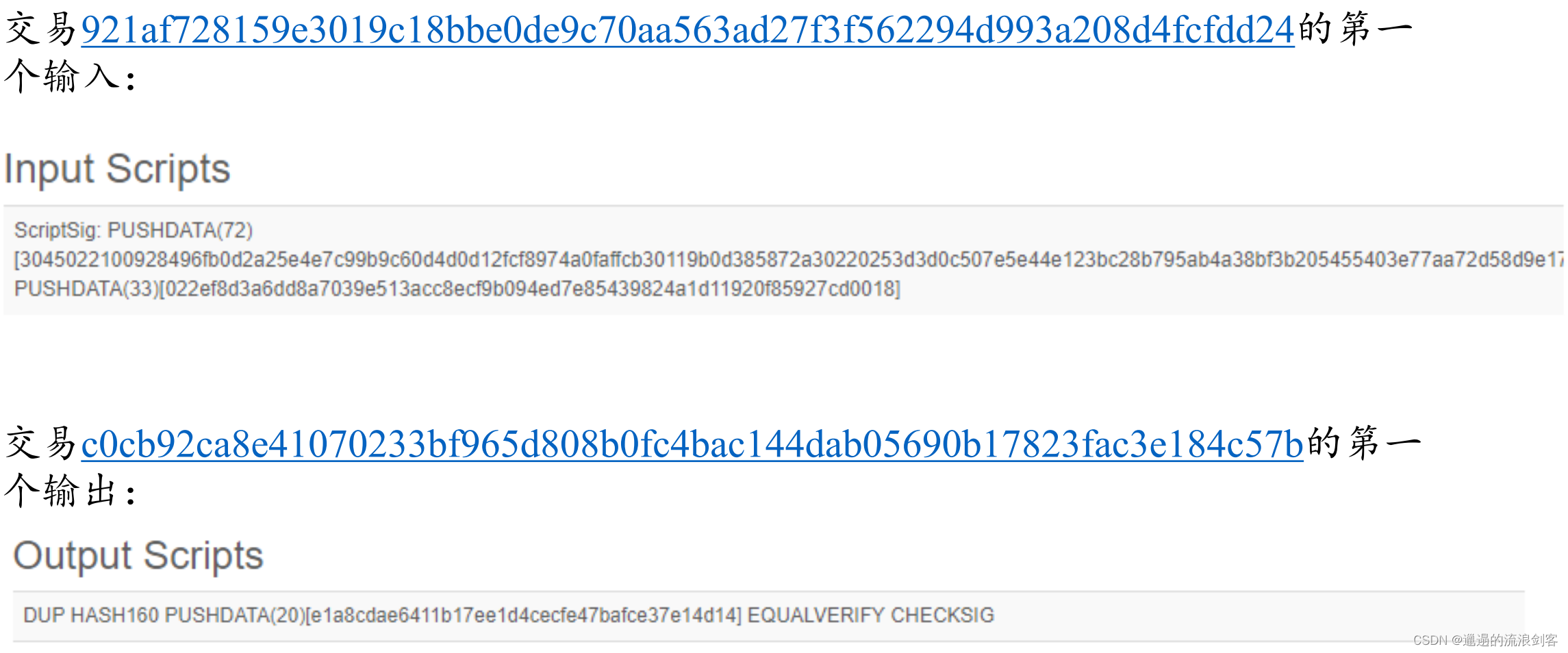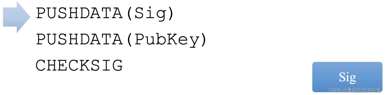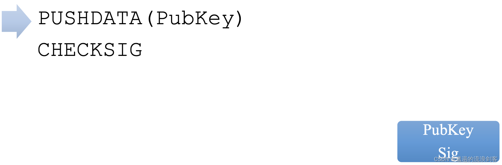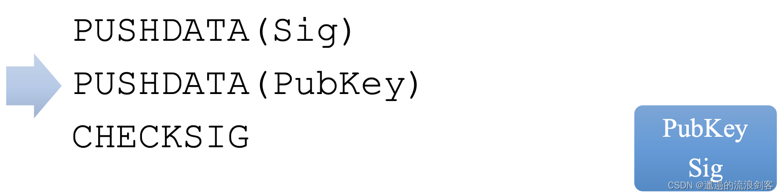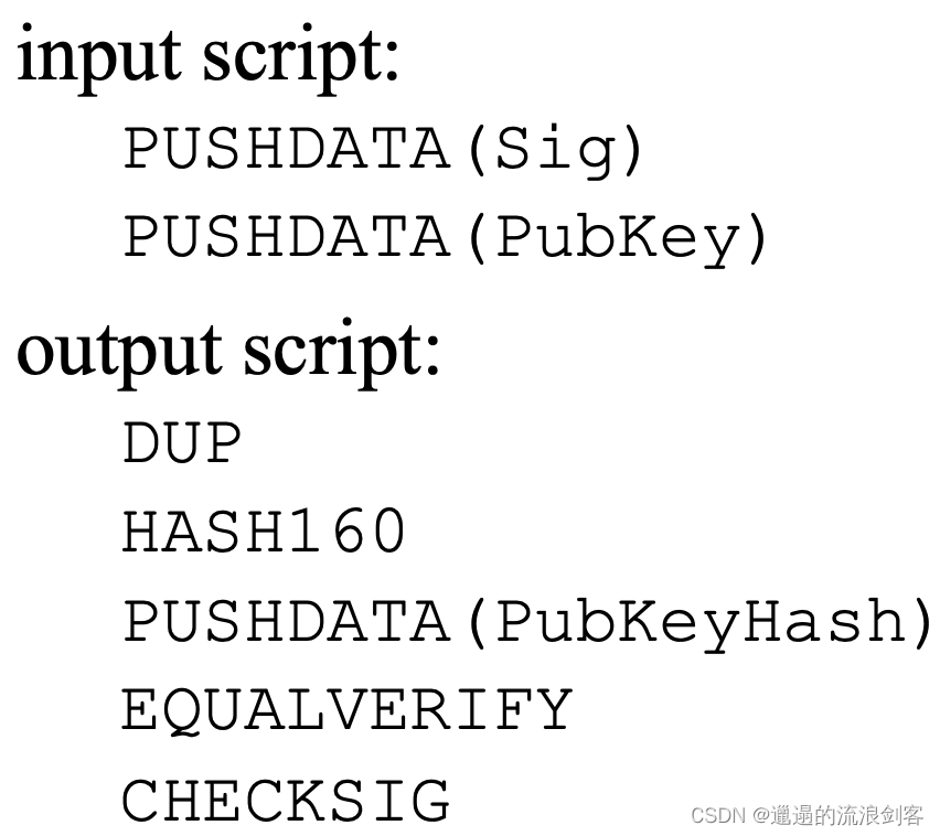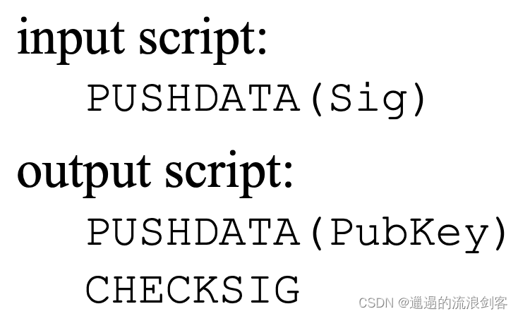 输入脚本中直接给出付款人的签名(付款人用自己的私钥对输入脚本所在的整个交易的签名),输出脚本中直接给出收款人(这里的收款人和前面的付款人是同一个人)的公钥,最后的CHECKSIG是检查签名时用的指令