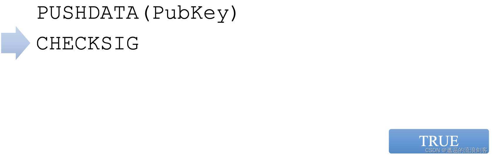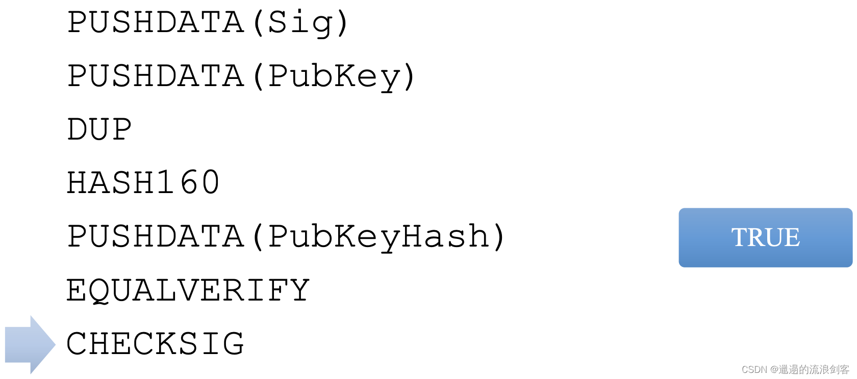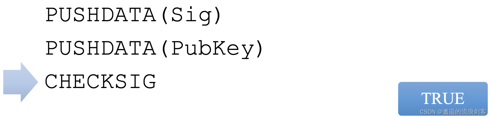 第三条语句,弹出栈顶的两个元素,用公钥PubKey检查一下签名Sig是否正确。如果正确,返回True,说明验证通过