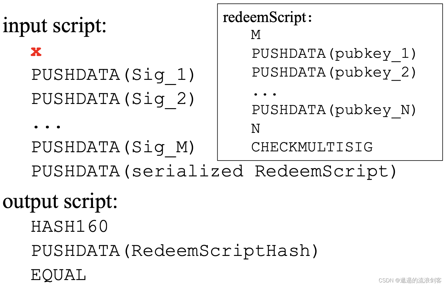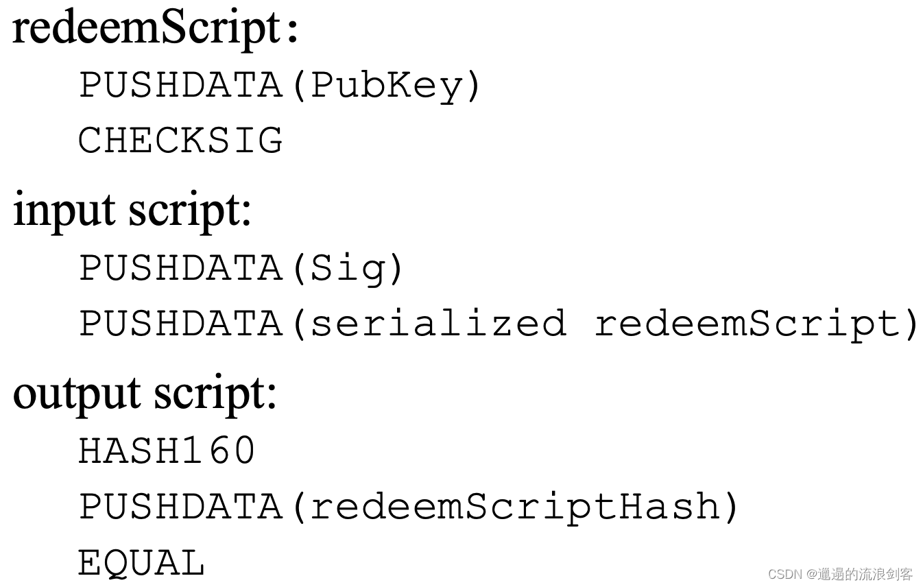 本质上是将复杂度从输出脚本转移到输入脚本,此时输出脚本只有三行,原来的复杂度被转入到赎回脚本redeemScript中。输出脚本只需要给出赎回脚本的哈希值即可。赎回脚本里要给出N个公钥还有N和M的值,赎回脚本在输入脚本提供,即收款人提供