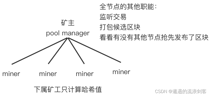 矿池将很多矿工组织起来,一般的架构就是一个矿主(pool manager)全节点去驱动很多矿机,下属矿工只负责计算哈希值,全节点的其他职能只由矿主来承担。有了收益以后再大家一起分配