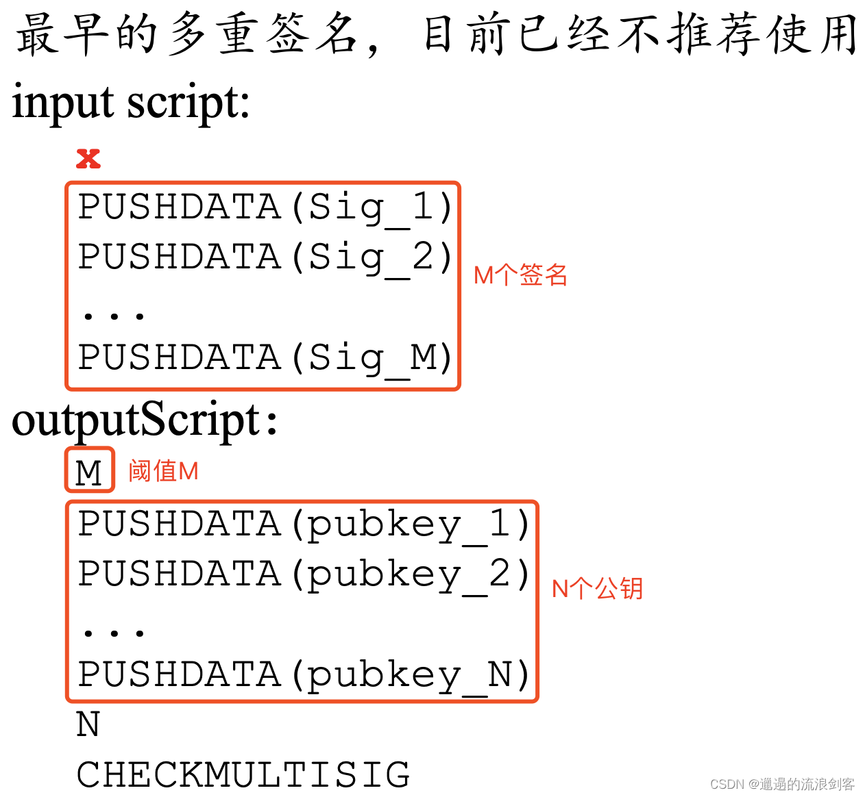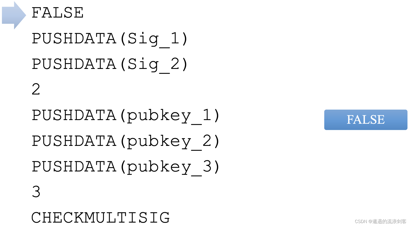 输入脚本的第一行有一个红色的X,是因为比特币中CHECKMULTISIG的实现存在一个bug,执行时会从堆栈上多弹出一个元素。这个bug现在已经无法修改,因为去中心化系统中软件升级代价极大,需要硬分叉修改。所以,实际中采用的方案是在输入脚本往栈中多压入一个无用元素