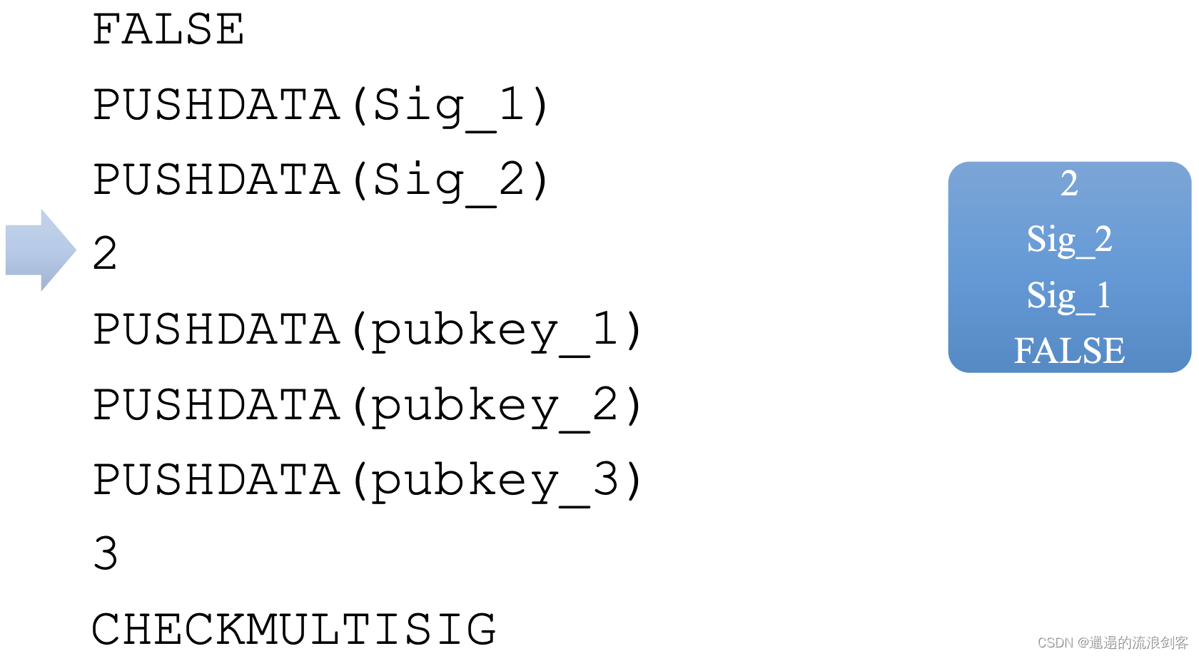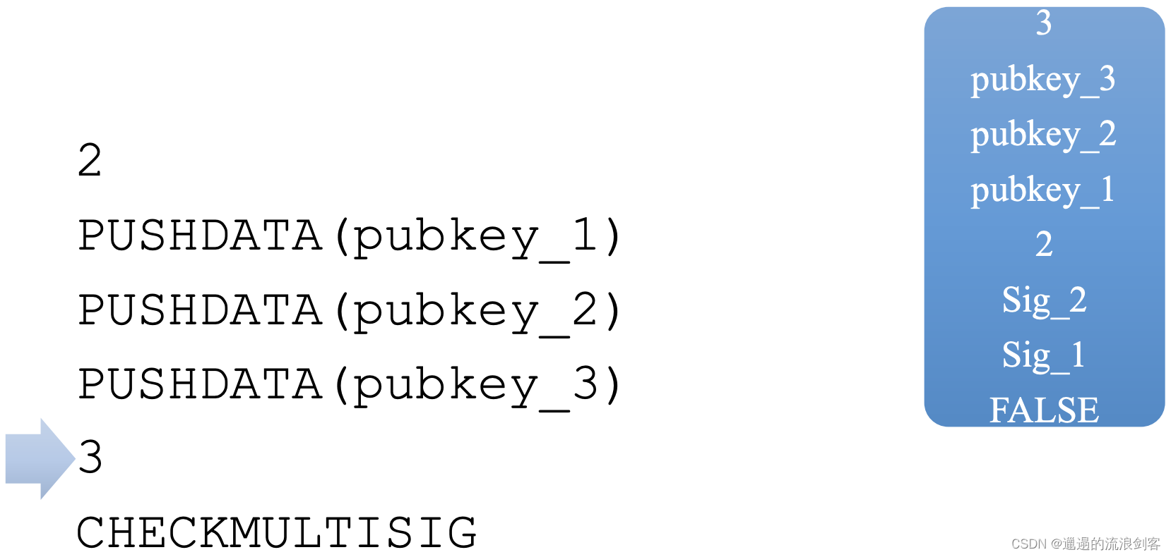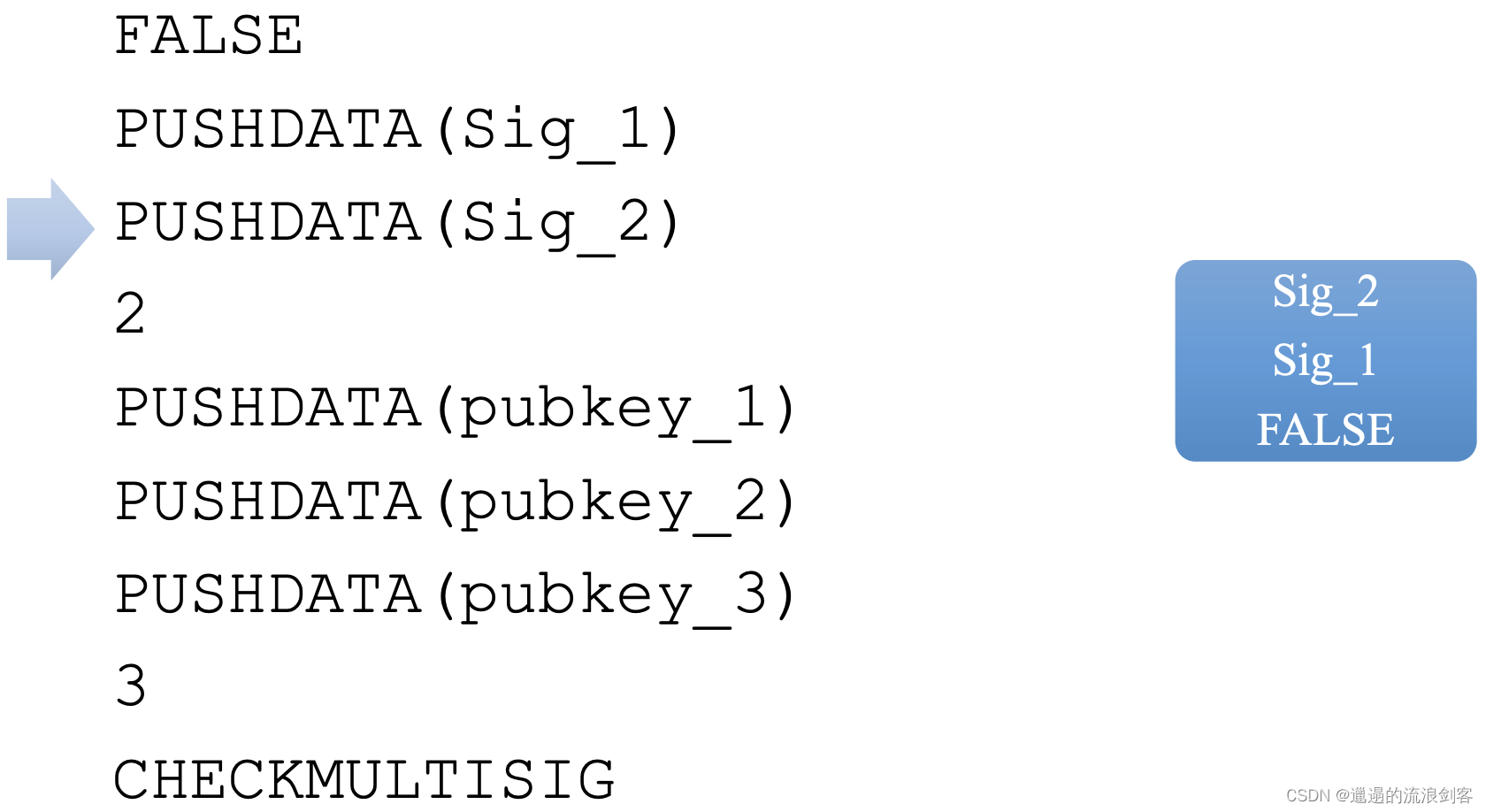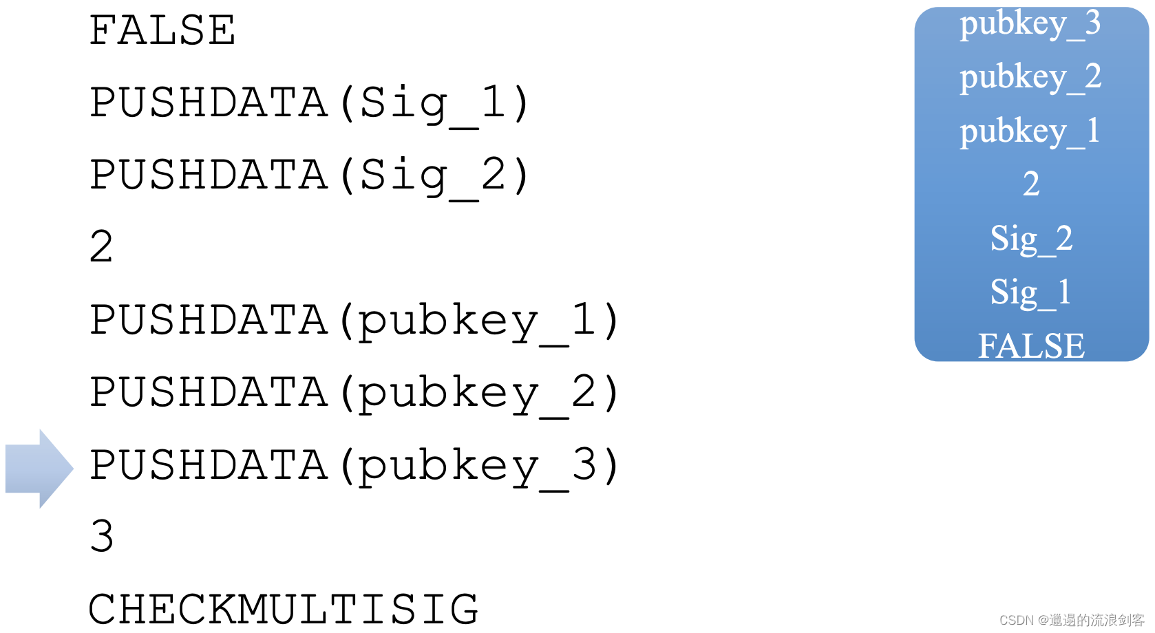 如下是一个N=3,M=2的多重签名脚本执行过程,给出的2个签名顺序和在公钥中相对顺序一致: