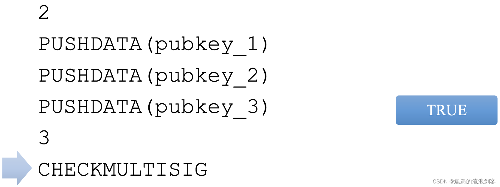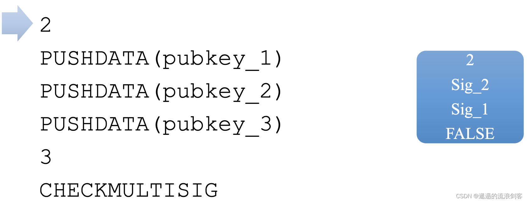 第六步,执行输出脚本中CHECKMULTISIG,是否栈中包含3个公钥对应签名中的2个,如果是,验证通过