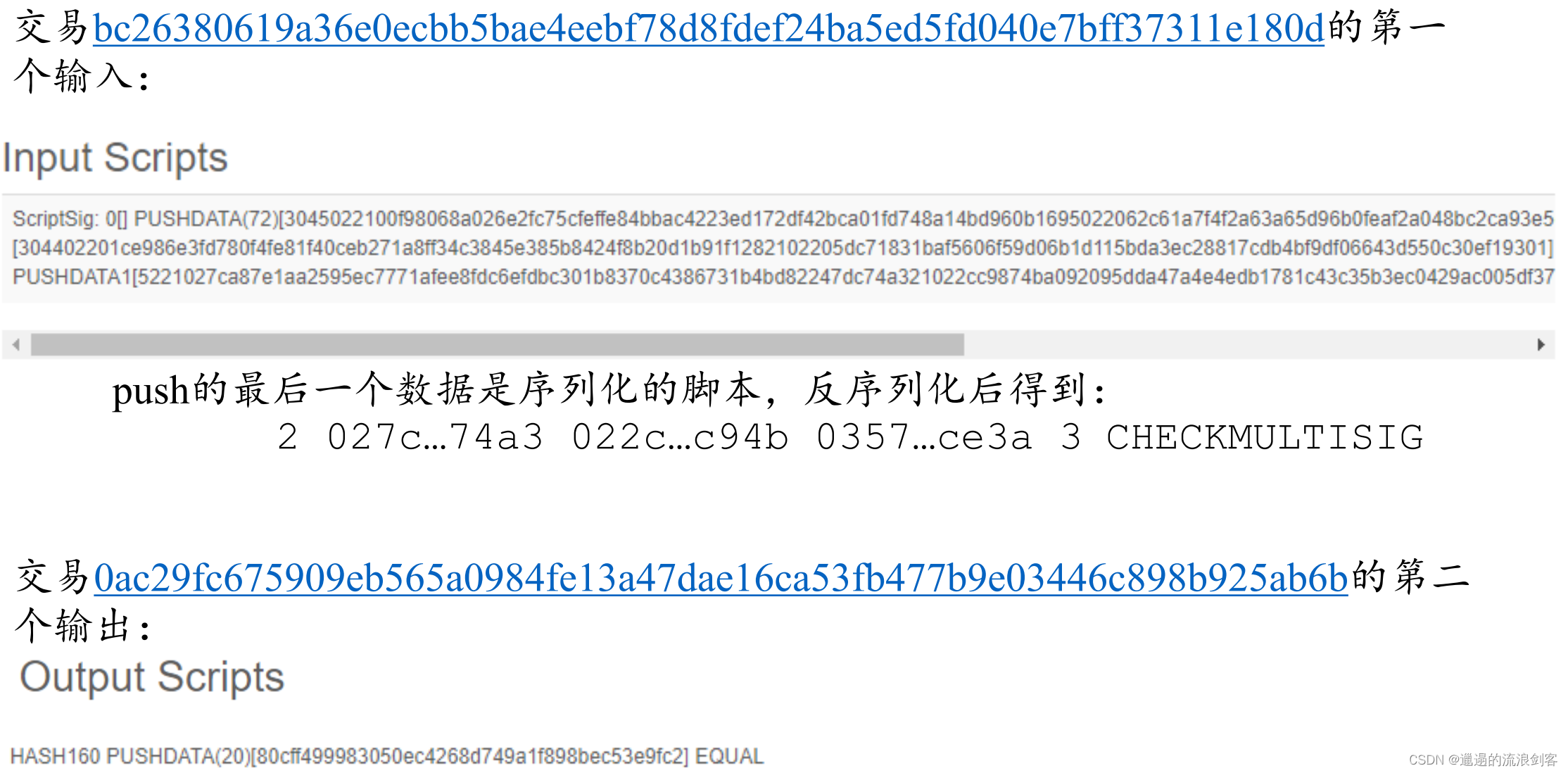 赎回脚本中给出公钥,输入脚本中给出交易签名和序列化后赎回脚本的具体内容,输出脚本中给出了赎回脚本的哈希值