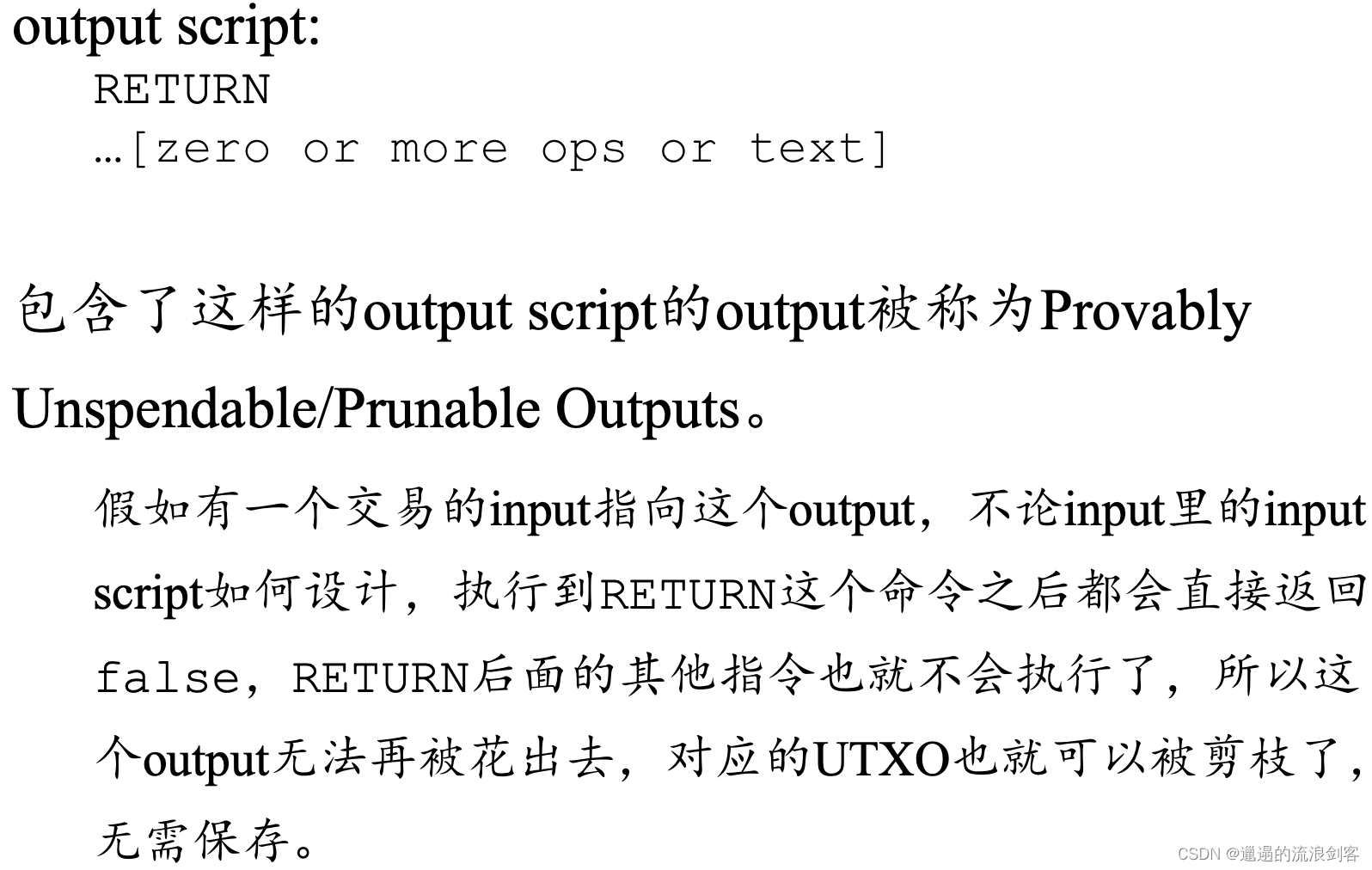 以RETURN开始,后面可以跟任何内容。RETURN操作无条件返回错误,所以包含该操作的脚本永远不可能通过验证。执行到RETURN,后续操作不会再执行。该脚本是证明销毁比特币的一种方法