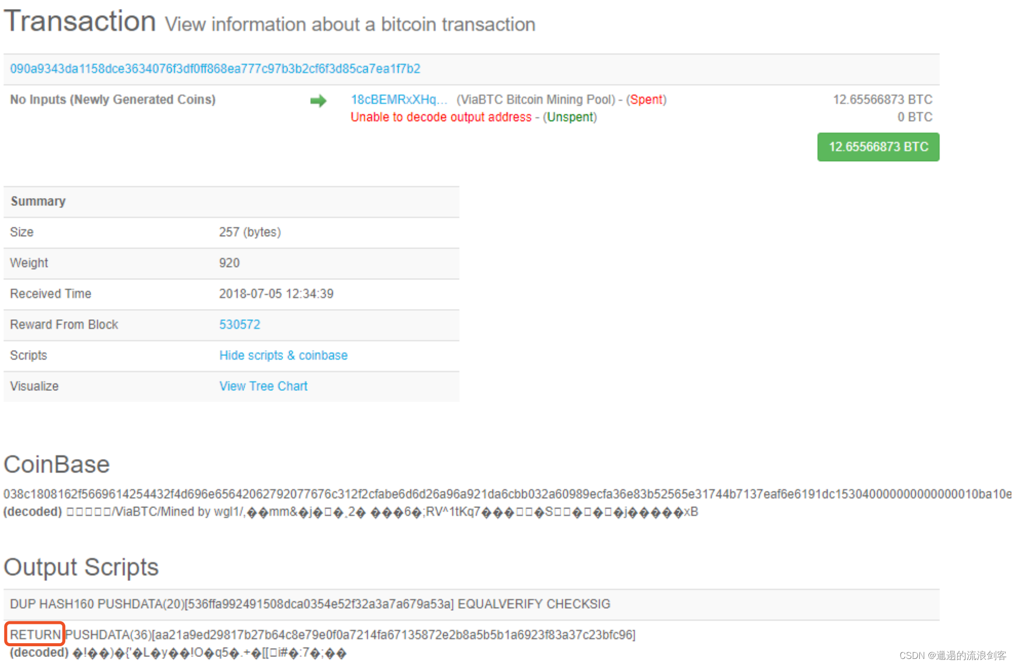 上图为一个coinbase transaction,这个交易包含两个输出,第一个输出脚本是正常的Pay to Public Key Hash,输出的金额就是得到的出块奖励+交易费;第二个输出的金额是0,输出脚本开头是RETURN,第二个输出的目的就是为了往区块链里写入一些内容