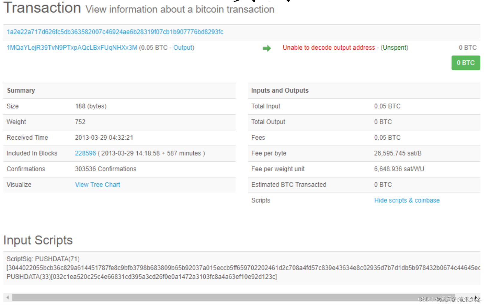 上图是一个普通的转账交易,输出脚本也是以RETURN开头的,这个交易的输入是0.05个比特币,输出金额是0,说明输入金额全部用于支付交易费了。这个交易并没有销毁任何比特币,只不过把输入里的比特币作为交易费转给挖到矿的矿工了