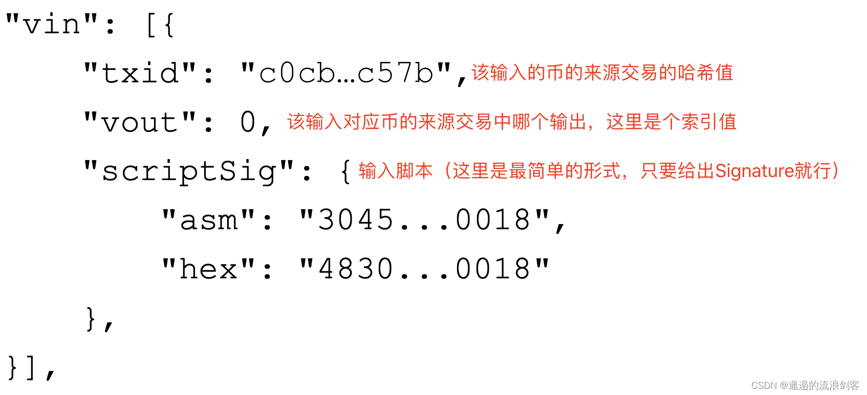 交易的输入是一个数组,一个交易可以有多个输入,这个例子中输入只有一个。如果一个交易有多个输入,那么每个输入都要说明币的来源,并给出签名