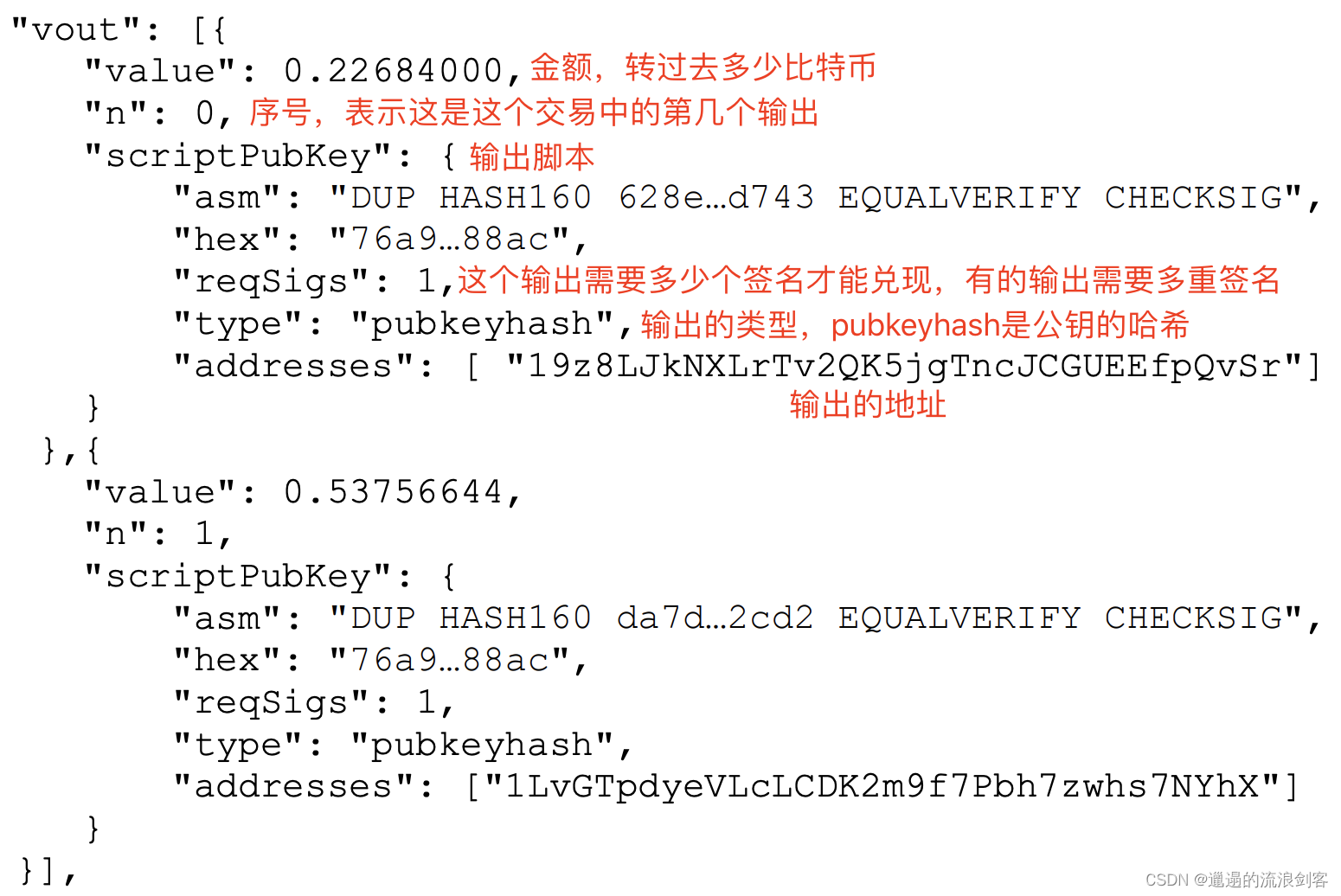 交易的输出也是一个数组结构,这里例子中有两个输出