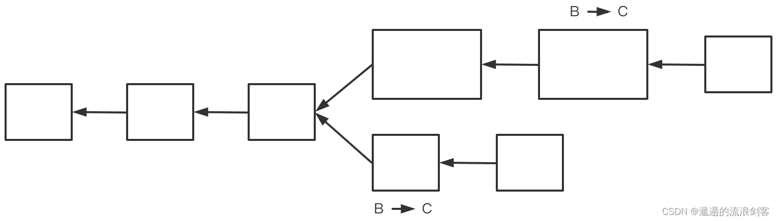 如上图,在新链上有一笔B->C的交易,对旧链而言这笔交易也是完全合法的,旧节点挖矿时就会把这个交易回放了。这样就相当于B从一个钱包中拿出一定数量的币给C,导致B的另一个钱包中也转给了C同样数额(注意不是价值,如以太经典ETC和以太坊ETH)的币到相应的钱包中