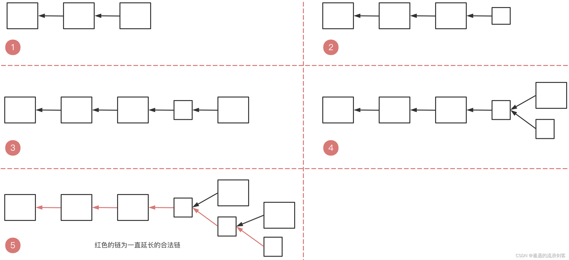 上图为当前区块链,此时软件更新,如上图2有一个新节点挖出了一个小区块(因为新的协议不小于0.5M)。对于旧节点来说,该区块符合1M大小限制,旧节点认可这个区块,会沿着这个新的小区块开始挖矿,如上图3。但是新节点会认为旧节点挖出的区块超过0.5M限制,为一个非法区块,不会认可该区块,会从前一个小区块开始挖矿,如上图4。因为旧节点认可新区块,最终会造成如上图5中的效果,旧节点挖出的区块一直被抛弃,无法得到出块奖励(因为不在最长合法链上)。这就倒逼旧节点升级软件,最终会实现区块链上的所有矿工共同认可新协议,实现软件协议的升级