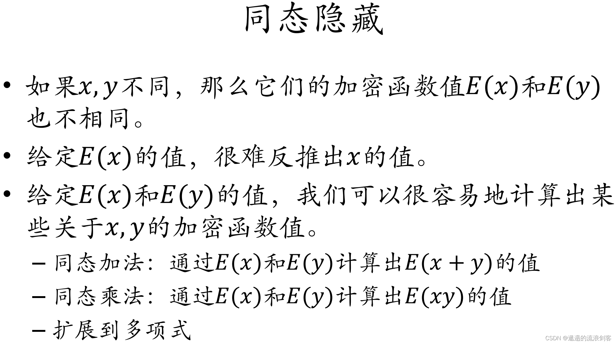 第三个性质最为重要,称为同态运算,说明对加密后的函数值进行某些代数运算,等价于对输入直接进行代数运算再加密