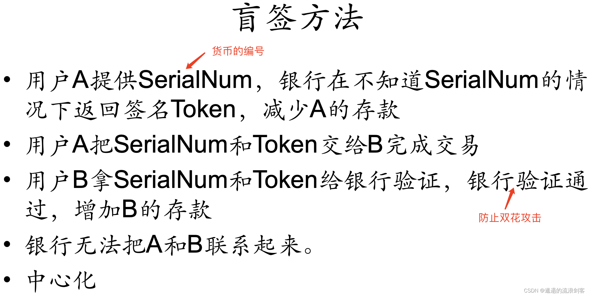 方案二:每个数字货币需要有个编号,央行数据库中记录编号的钱有没有被花过,是在谁的手里,可以防止双花攻击。这个方案不利于匿名性,每一笔交易都必须通过央行,央行知道用户所有的交易信息。盲签可以解决这个问题