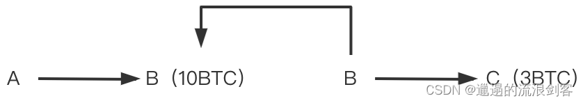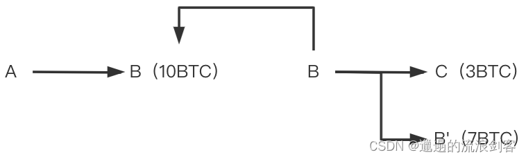 A转给B 10个比特币,将来B要转给C 3个比特币,币的来源是A转给B的这个交易。如上图这样处理,剩下的7个比特币会当做交易费给花出去了