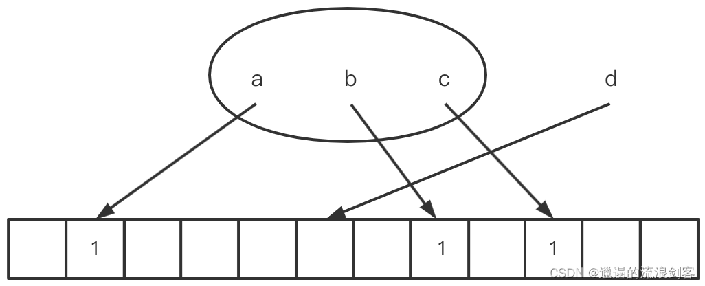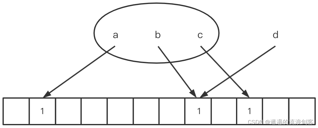 可以用这个哈希函数H对d取哈希值,取完之后发现映射到一个值为0的位置,说明d这个元素一定不在这集合里