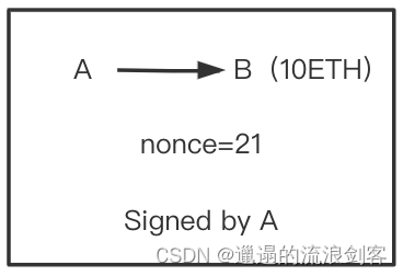 这个节点一开始A的nonce=20,然后现在发布这个交易,这个节点一看,这个交易是合法的,是可以执行的,同时更新一下nonce=21。以后如果有人重放这个交易,这个节点一看,这个nonce已经是21了,已经被执行过了,就不会再执行一遍了