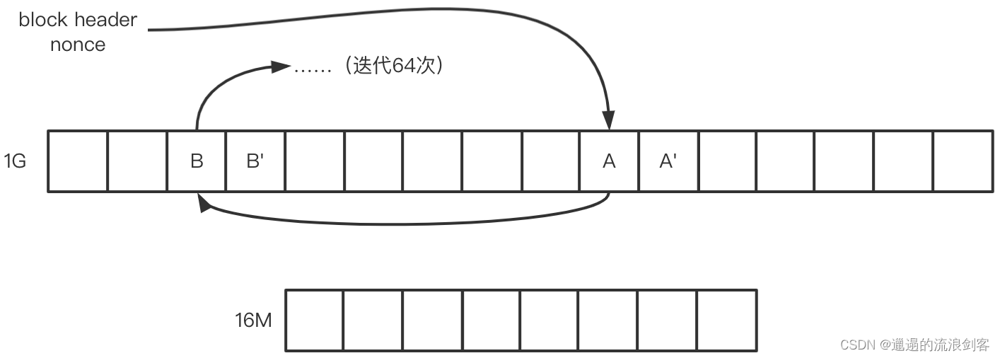 - 求解puzzle的时候,用的是大数据集中的数,这个cache是不用的,按照伪随机数的顺序从大的数据集中读取128个数。根据区块block header和其中的nonce值计算一个初始哈希,根据其映射到某个初始位置A,读取A位置的数及其相邻的后一个位置A’上的数,根据该两个数进行运算,算得下一个位置B,读取B和B’位置上的数,依次类推,迭代64次,每次读两个数,共读取128个数。最后,计算出一个哈希值与挖矿难度目标阈值比较,若不符合就重新更换nonce,重复以上操作直到最终计算哈希值符合难度要求或当前区块已经被挖出