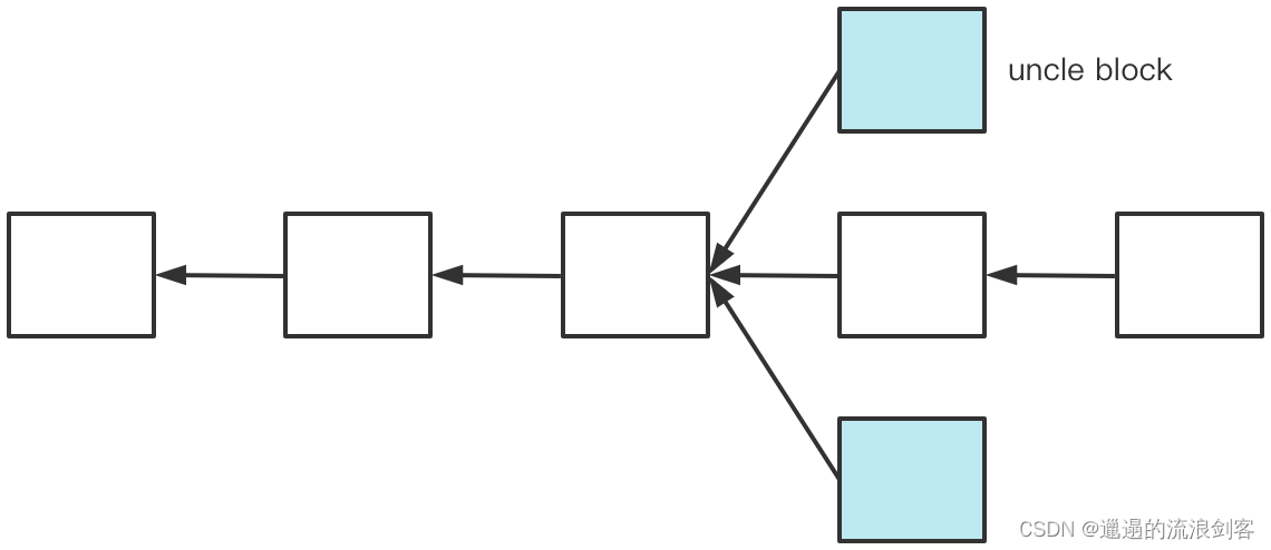 叔父区块的奖励叫做uncle reward,当前区块包含一个叔父区块,就会得到 1 32 \\frac{1}{32} 321的出块奖励,不管包含的是哪一个辈分的叔父