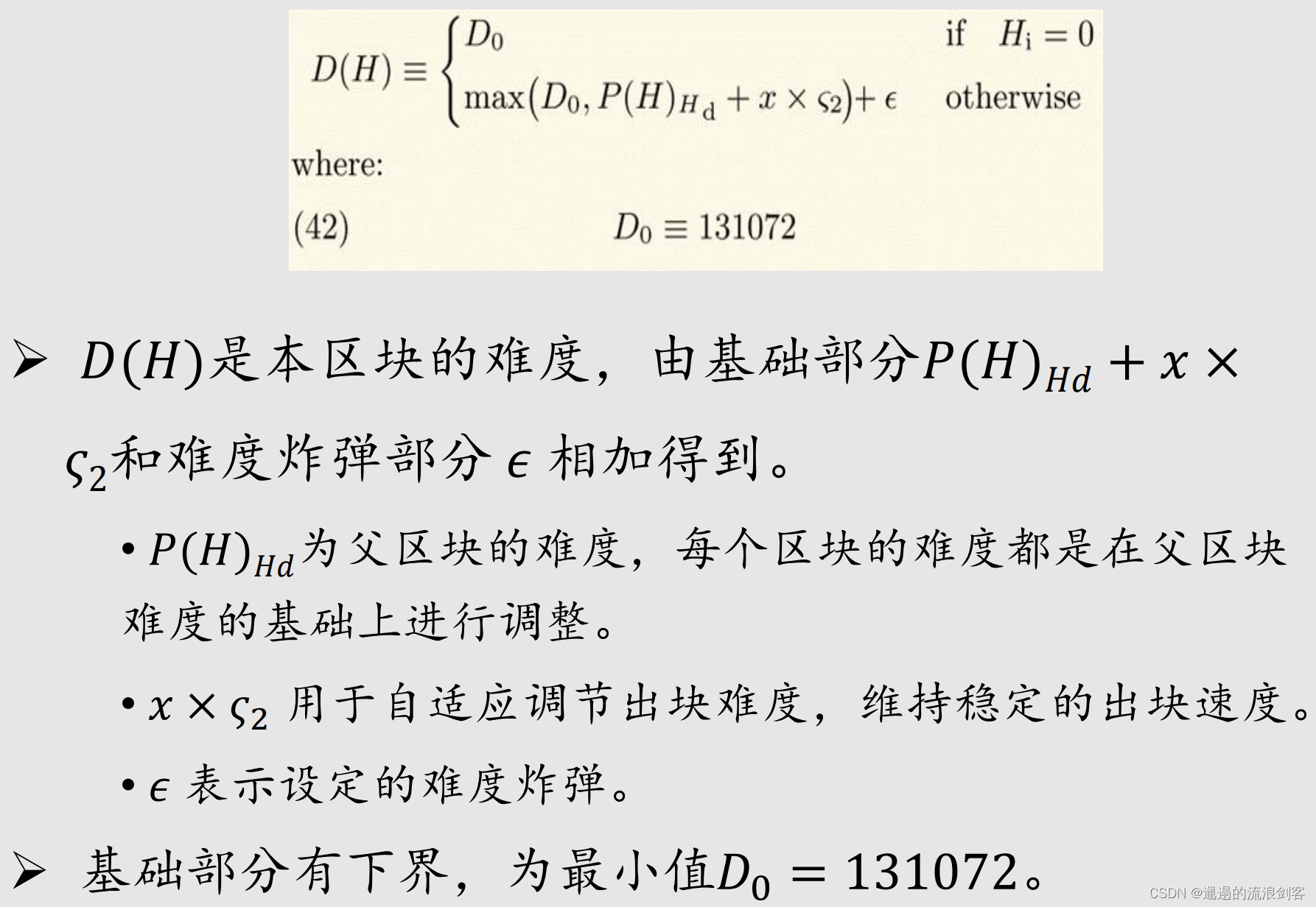 上图是以太坊的难度调整公式,H是指当前这个区块, H i H_i Hi是这个区块的序号,D(H)是这个区块当前的难度。这个难度调整的公式有两部分,max括号里的是第一部分,管它叫基础部分,目的是为了维持出块时间大概在十五秒左右;后面跟的是第二部分,也称为难度炸弹,主要是为了向权益证明过渡,将来的以太坊想把共识机制从工作量证明逐步转入权益证明