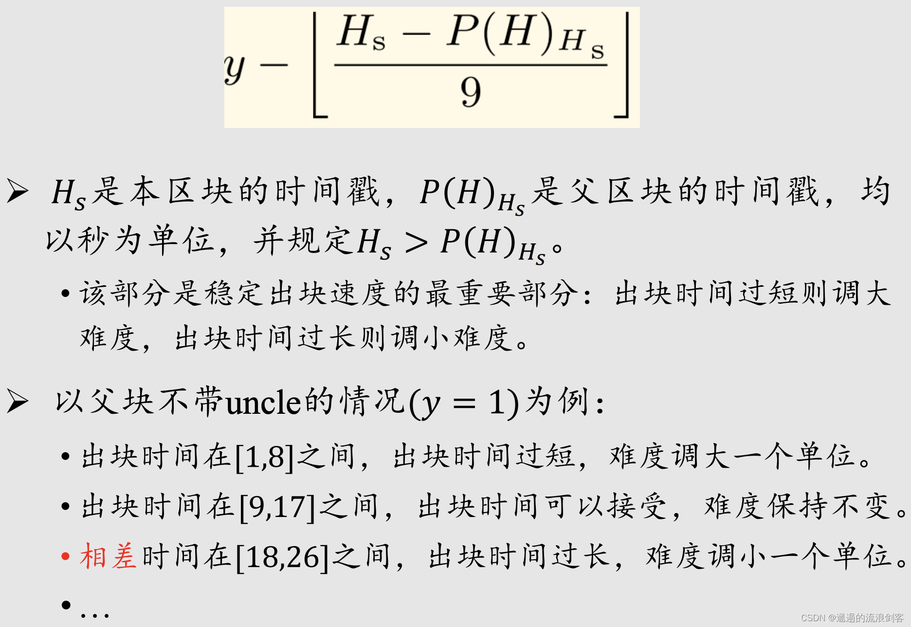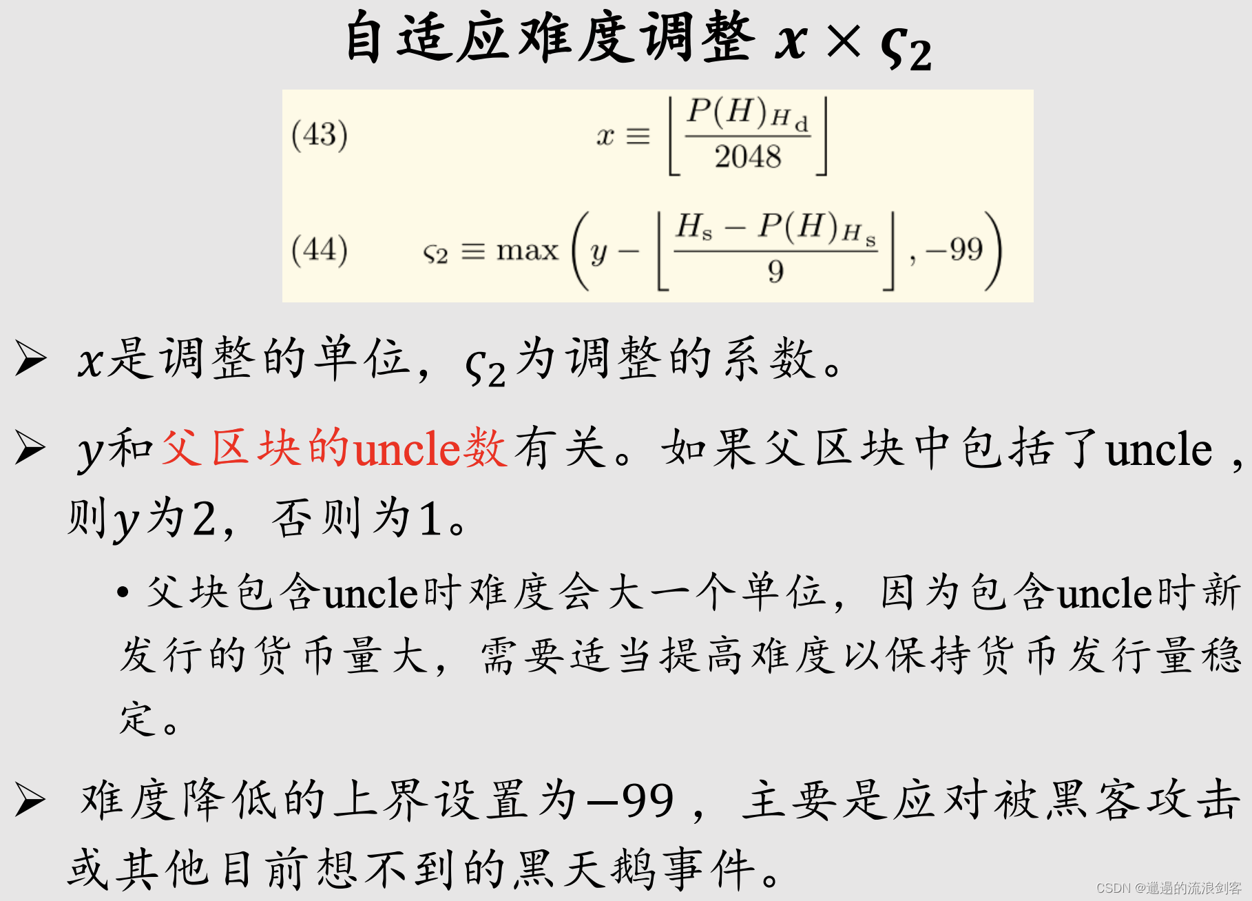 上图这个公式里max的第二项有一个-99,如果单次的出块时间非常非常长,你可能前面算出来是个负的很厉害的数,但是你一次性下调也不能超过99个单位,这是为了防止一些系统中出现的异常情况,像一些黑天鹅事件,正常情况下,不能出现这个幅度的下调