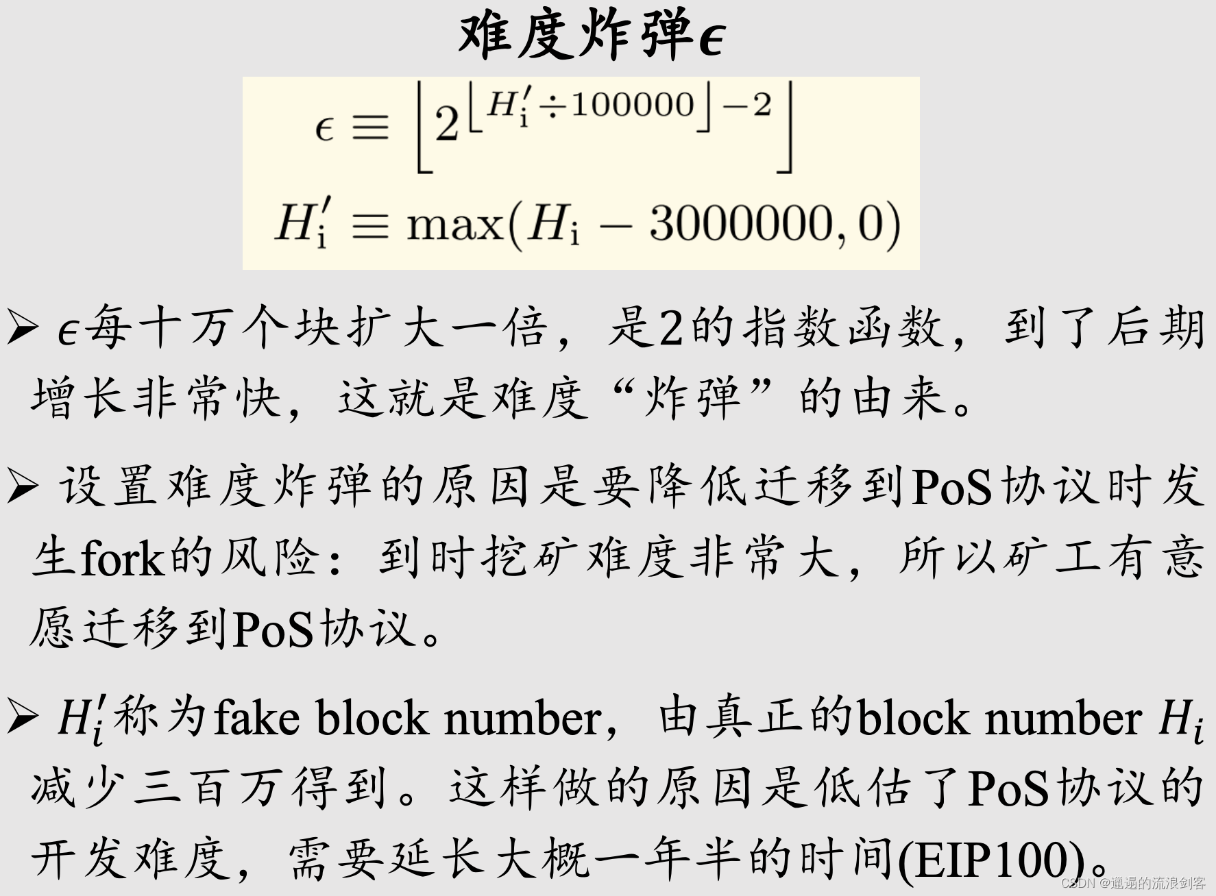 以太坊最后在一个EIP当中,决定计算难度炸弹地时候,要把区块号回退300万个区块来计算,就这个公式中,把真实的区块号减去三百万,算出 H i ′ H_i’ Hi′,这个可以看成是假的区块号,然后算难度炸弹的时候是用这个假的区块号算的,这个给权益证明的上限争取了一些时间