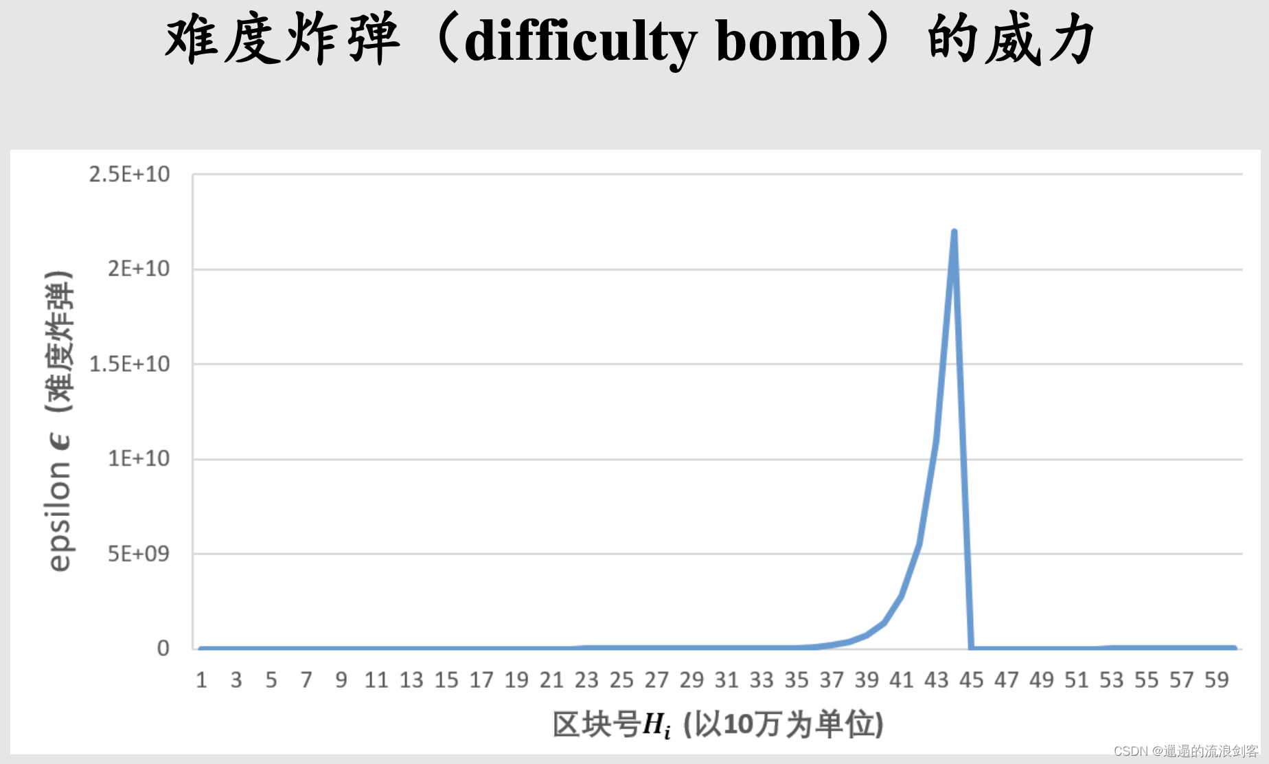 然而随着时间的推移,区块号变得越来越大,这个时候难度炸弹的威力开始显现出来,指数函数增长到后期,速度是非常恐怖的,所以当初设计的思想是等到这个难度炸弹的威力开始发挥出来的时候,也正是从以太坊需要从工作量证明转入权益证明的时候,那个时候因为挖矿变得越来越难了,所以大家也就原意转入权益证明了,因为如果不转的话,要挖出矿来,就太费劲了