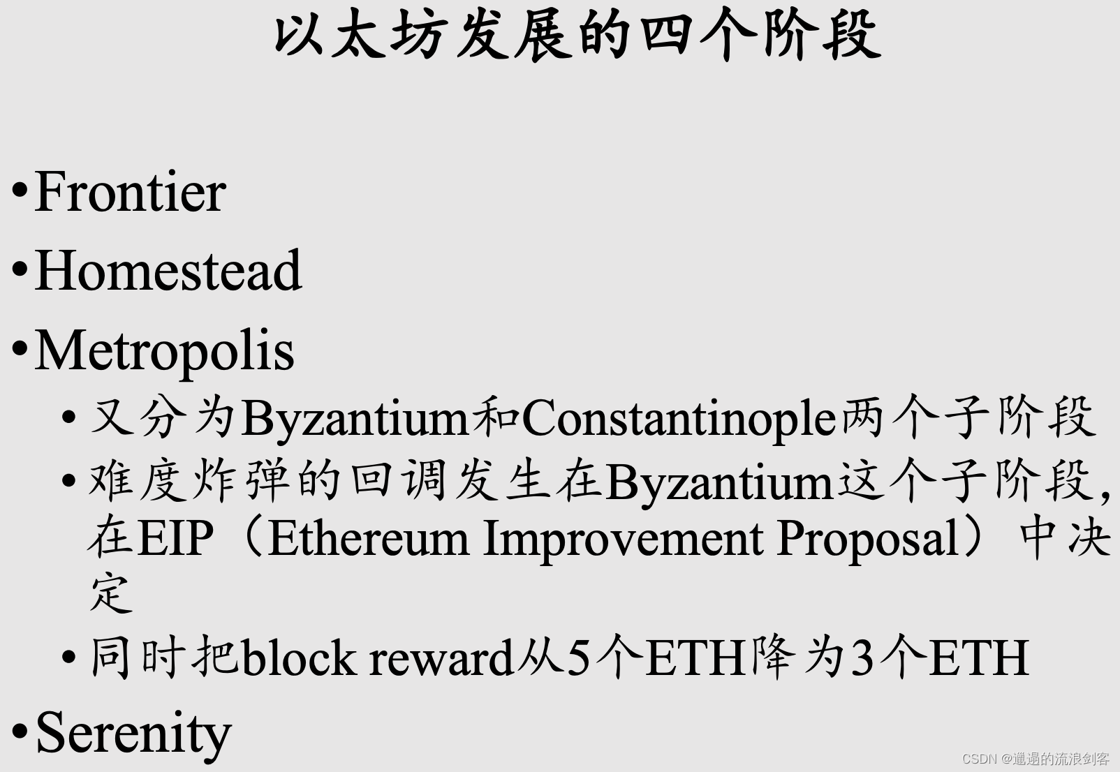 以太坊的发展被分成了四个阶段,Frontier、Homestead、Metropolis,Serenity,其中Metropolis又分为两个阶段,Byzantium和Constantinople,我们处于Byzantium阶段(拜占庭阶段),难度炸弹的回调就是在Byzantium阶段进行的
