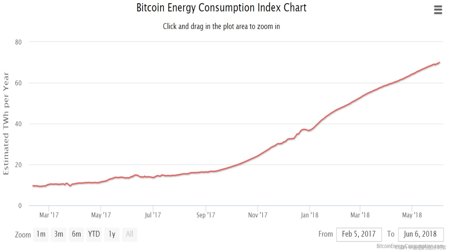 上图展示的是比特币能耗随时间变化的情况,y轴是TWh是Terawatt Hours,这是 1 0 12 10^{12} 1012,KWh=Kilowatt hours,是 1 0 3 10^3 103,所谓叫千瓦时,一度电的意思,通过这个图可以看出比特币能耗随时间是不断增长的