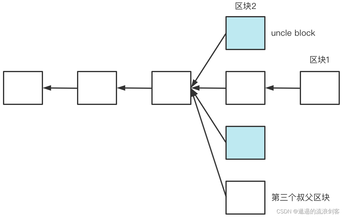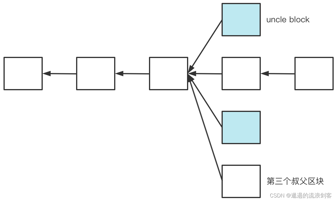 - 如果不限制叔父的辈分,不限制隔多少代的话,那么实现起来,对于全节点来说,要维护的状态的就太多了,因为可能要记着隔着100代以前有哪些叔父区块,发布的区块包含的叔父区块其他节点同样也是要验证一下的
