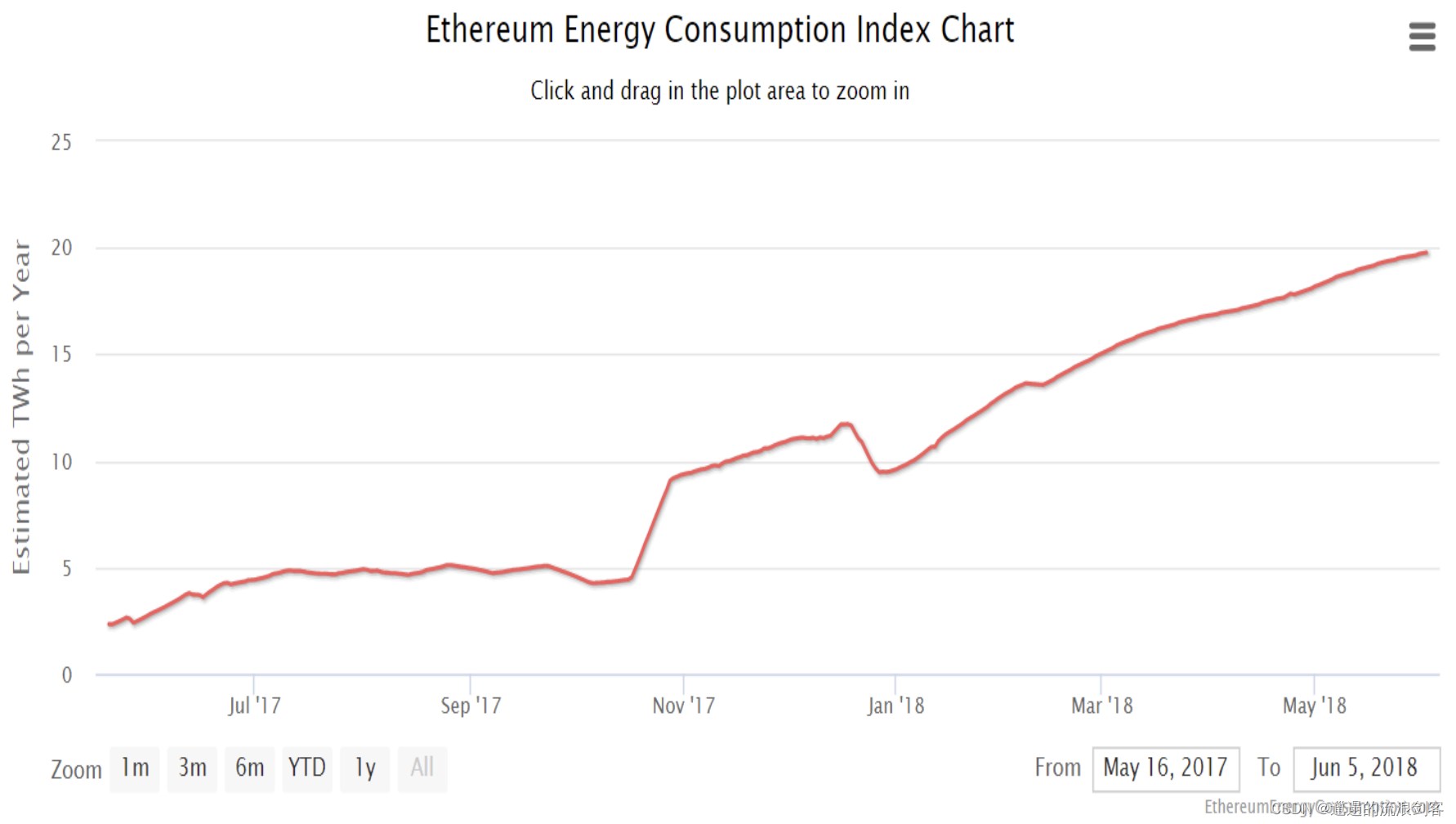 上图是以太坊的统计数据,以太坊的能耗也是随时间增长的,中间有一些波动