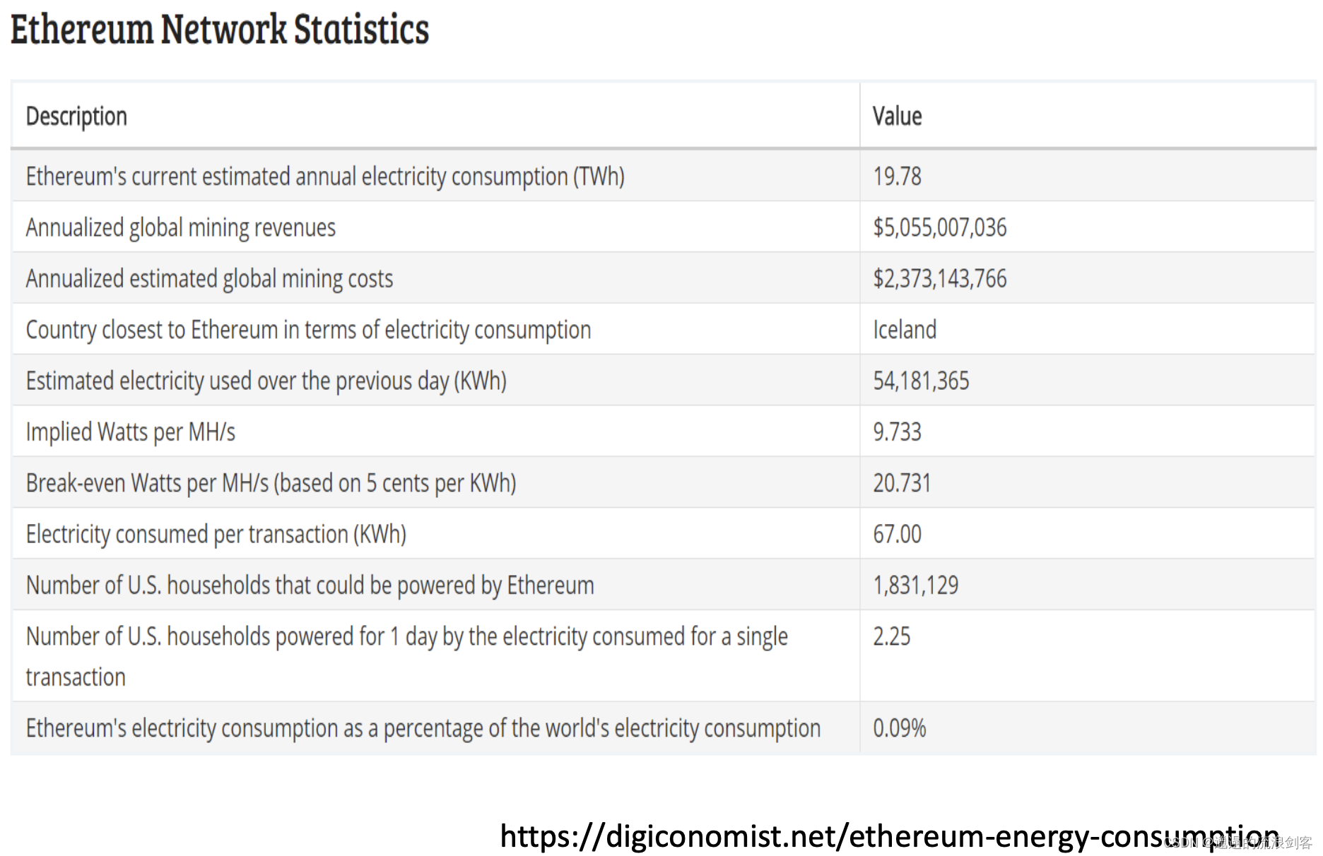 从具体的数据上来看,以太坊一年的能耗大概是20个TWh,跟刚才比特币的70个还是少了不少,相当于冰岛这个国家的能耗,也相当于183万个美国家庭的能耗,能耗占全世界总能耗的0.09%,平均到每个交易上,每个交易是67个千瓦时,相当于2.25个美国家庭一天的能耗