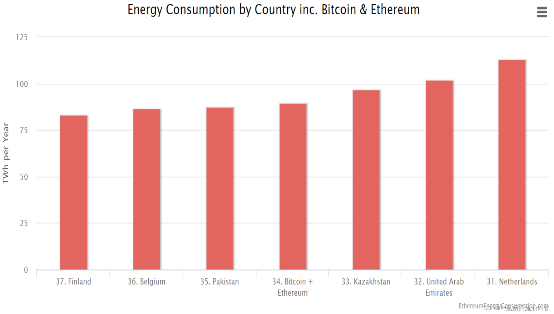 以太坊每年挖矿的收入是50多亿美元,费用接近24亿美元。如果把比特币和以太坊的能耗加在一起当作一个国家来算的话,它在国家中的排行榜是这样的,芬兰,比利时,巴基斯坦,然后就是比特币加以太坊,然后是哈萨克斯坦,阿联酋,荷兰