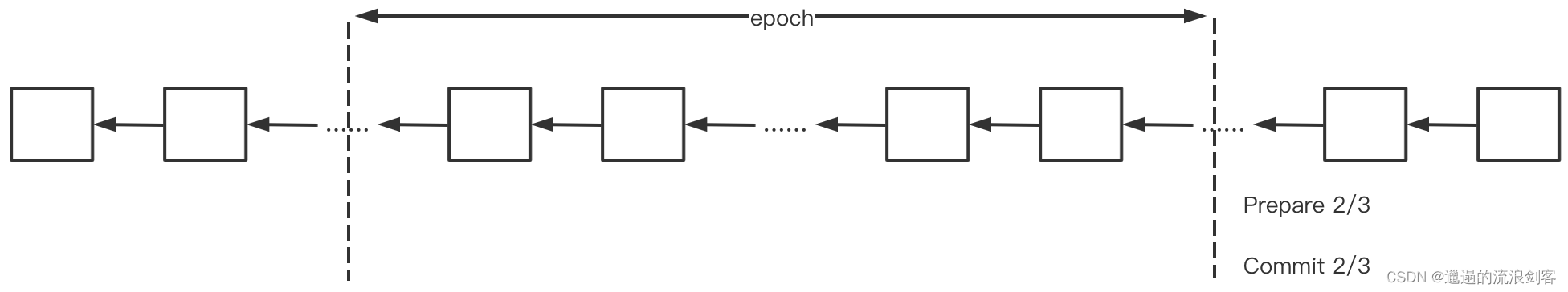 实际系统当中不再区分这两个Message,而且把这个epoch从原来的100个区块减少到50个区块,变成了每50个区块就是一个epoch,每个epoch只用一轮投票的就行了,这一轮投票对于上一个epoch来说是个Commit Message,对于下一个来说是一个Prepare Message,那么要连续两轮投票,两个epoch都得到 2 3 \\frac{2}{3} 32以上的多数,才算有效
