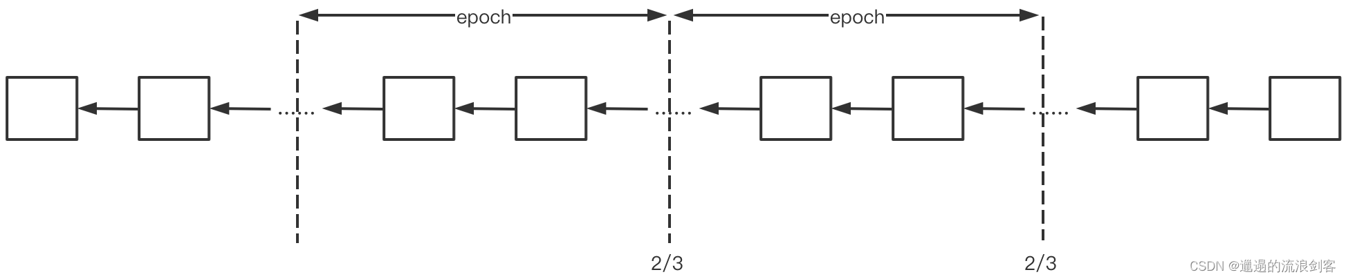 上图是一条区块链,两个虚线中间间隔了100个区块,原始版本的Casper协议是把中间是间隔了100个区块定义成一个epoch,然后结束有两轮投票,每一个要 2 3 \\frac{2}{3} 32的验证者才能算通过,这是原始的版本