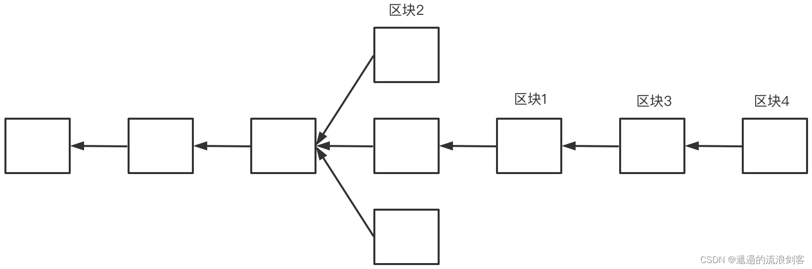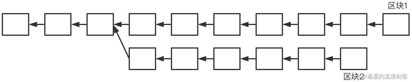 问题2:前面举的例子中,叔父区块的共同特点是同时分叉之后第一个区块。如果分叉之后后面还跟着一串,那些怎么办?如下图所示,上面是最长合法链,下面是分叉链,区块2算不算是区块1的叔父区块呢?