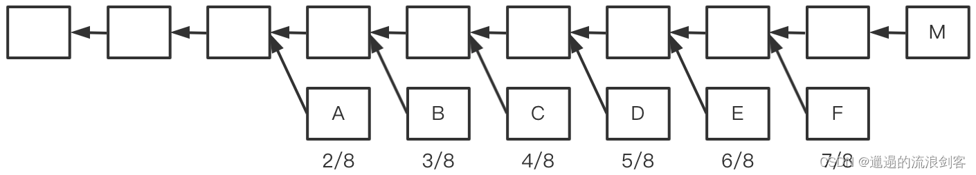 如上图所示,M为区块链上一个区块,F是M严格意义上的叔父,E为其严格意义上的爷爷辈。以太坊中规定,如果M包含F辈区块,则F获得 7 8 \\frac{7}{8} 87出块奖励;如果M包含E辈区块,则F获得 6 8 \\frac{6}{8} 86出块奖励,以此类推向前。直到包含A辈区块,A获得 2 8 \\frac{2}{8} 82出块奖励,再往前的叔父区块,对于M来说就不再认为是M的叔父了
