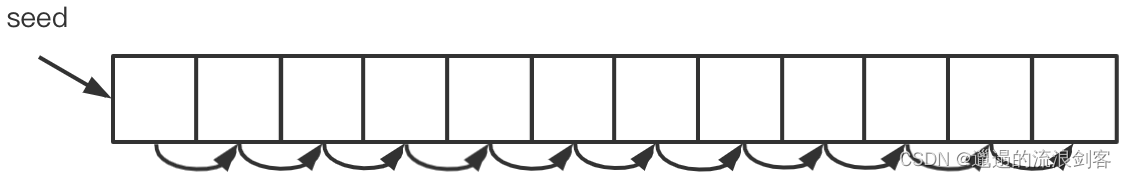 开一个很大的数组,然后按照顺序填充一些伪随机数。seed为种子节点,通过seed进行一些运算获得第一个数,之后每个数字都是通过前一个位置的值取哈希得到的。伪随机数是说取哈希值后的值你也不知道,看上去就是乱七八糟的数一样,就好像随机数,但我们不可能真的用随机数,真的用随机数没法验证。填充完之后,数组里面的数值是有前后依赖关系的,是从第一个数依次算出来的